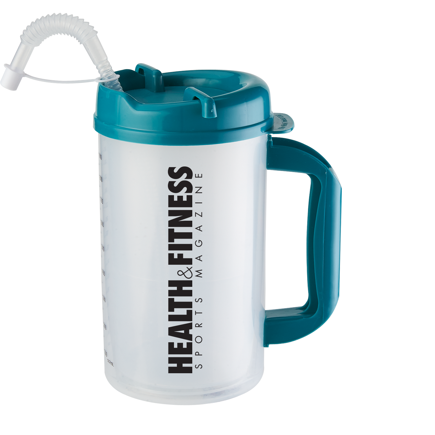 Constructed of Polypropylene material Double wall construction prevents condensation (sweat-resistant) Color matching lid and handle Twist-open lid protects drinks from spilling when bumped 11-1/4” bendable straw included Features measurement markings in ounces and milliliters Top rack dishwasher safe FDA Compliant BPA free