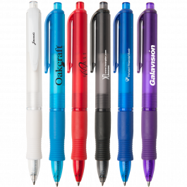 Wide-body retractable ballpoint pen with rubber grip Colored frost barrel with matching accents Black medium point High-quality Glide-Write™ ink