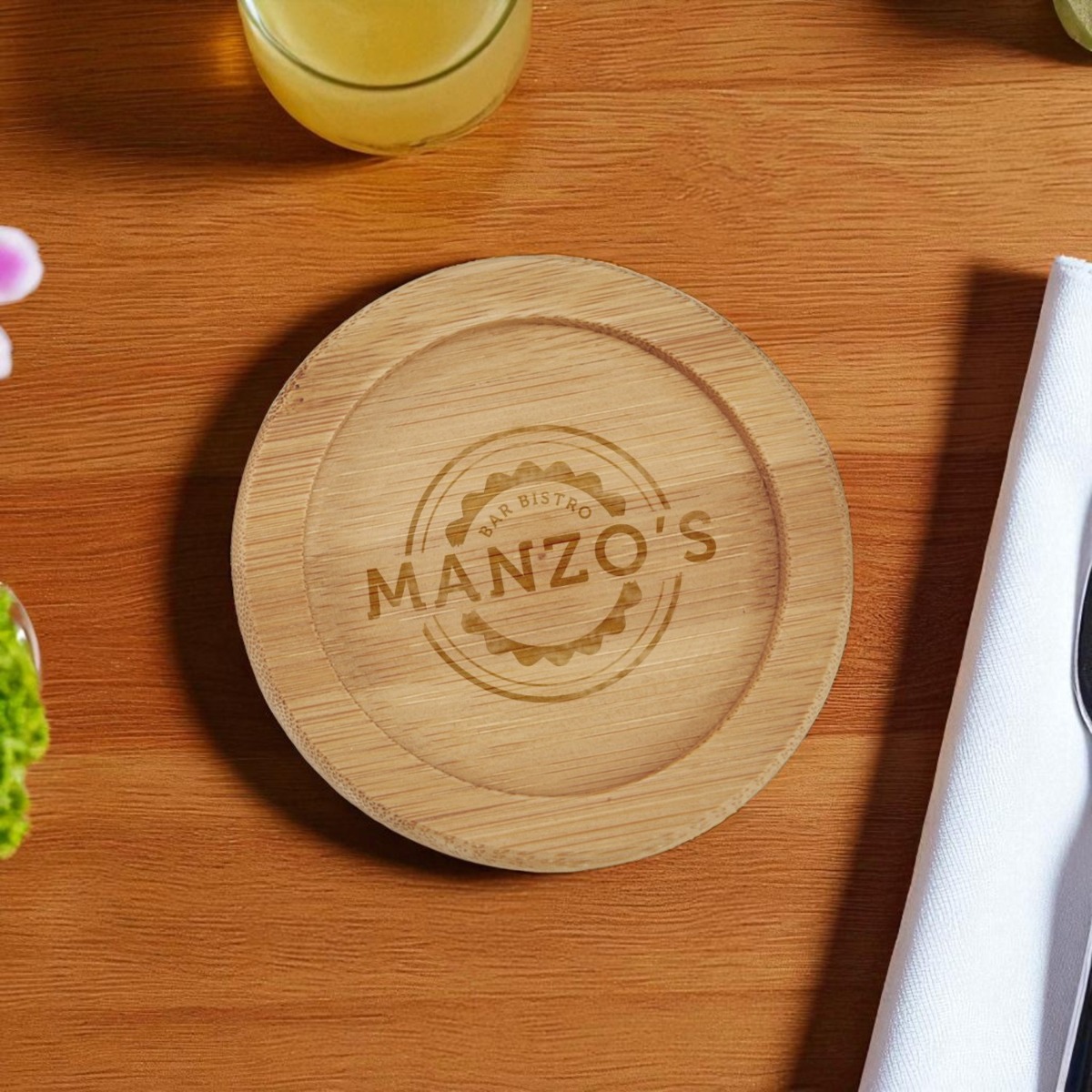 Made from environmentally friendly bamboo Features a striped wood grain appearance Round coaster with rim around edge Naturally heat and bacteria resistant Best to hand wash with warm water and mild soap/detergent Due to natural variations in the grain, laser engraved imprints may have slightly different shades