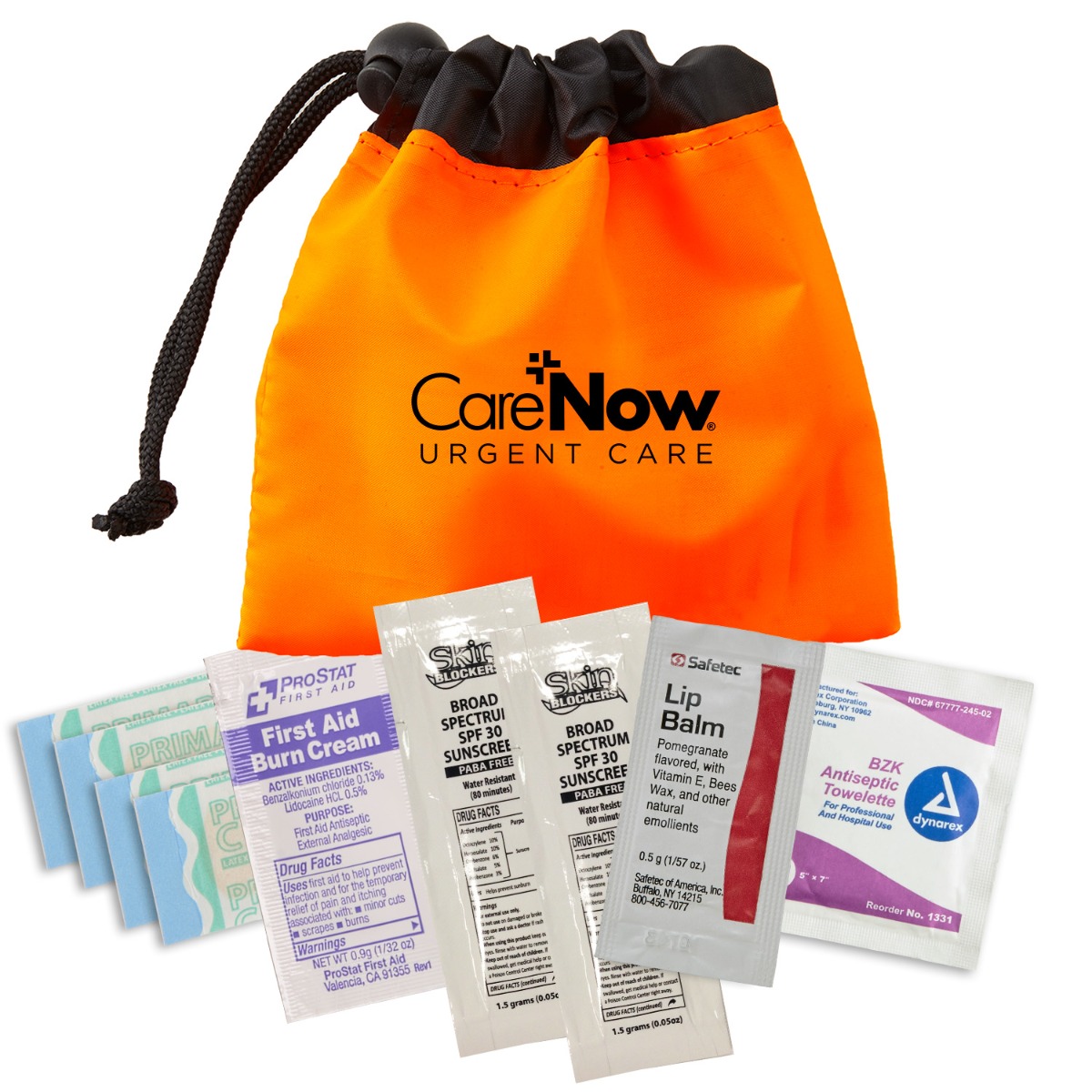 Includes 4 latex-free bandages, 2 sunscreen packets, 1 antiseptic towelette, 1 first aid cream packet and 1 lip balm