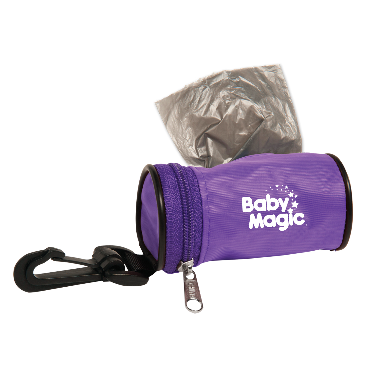 70D nylon construction Includes 20 plastic disposable bags (12 1/2" H x 8 3/4" W) Plastic swivel clip Discrete way to dispose dirty diapers when you are on the go