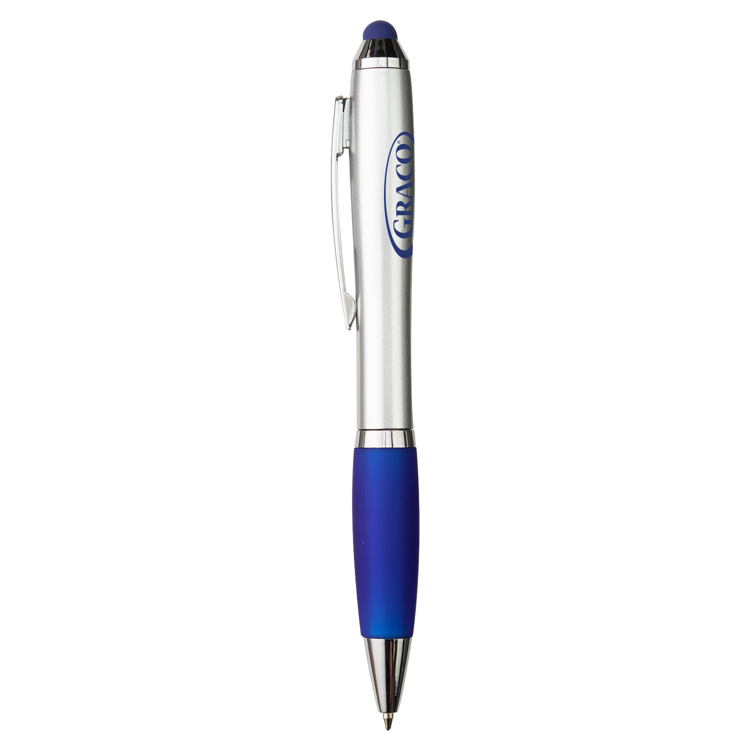Classic soft-touch twist action pen with rubber grip Responsive capacitive stylus Silver barrel with chrome colored ferrule, clip & ring Rubber grip color matches silicone stylus tip Black medium point High-quality Glide-Write™ ink