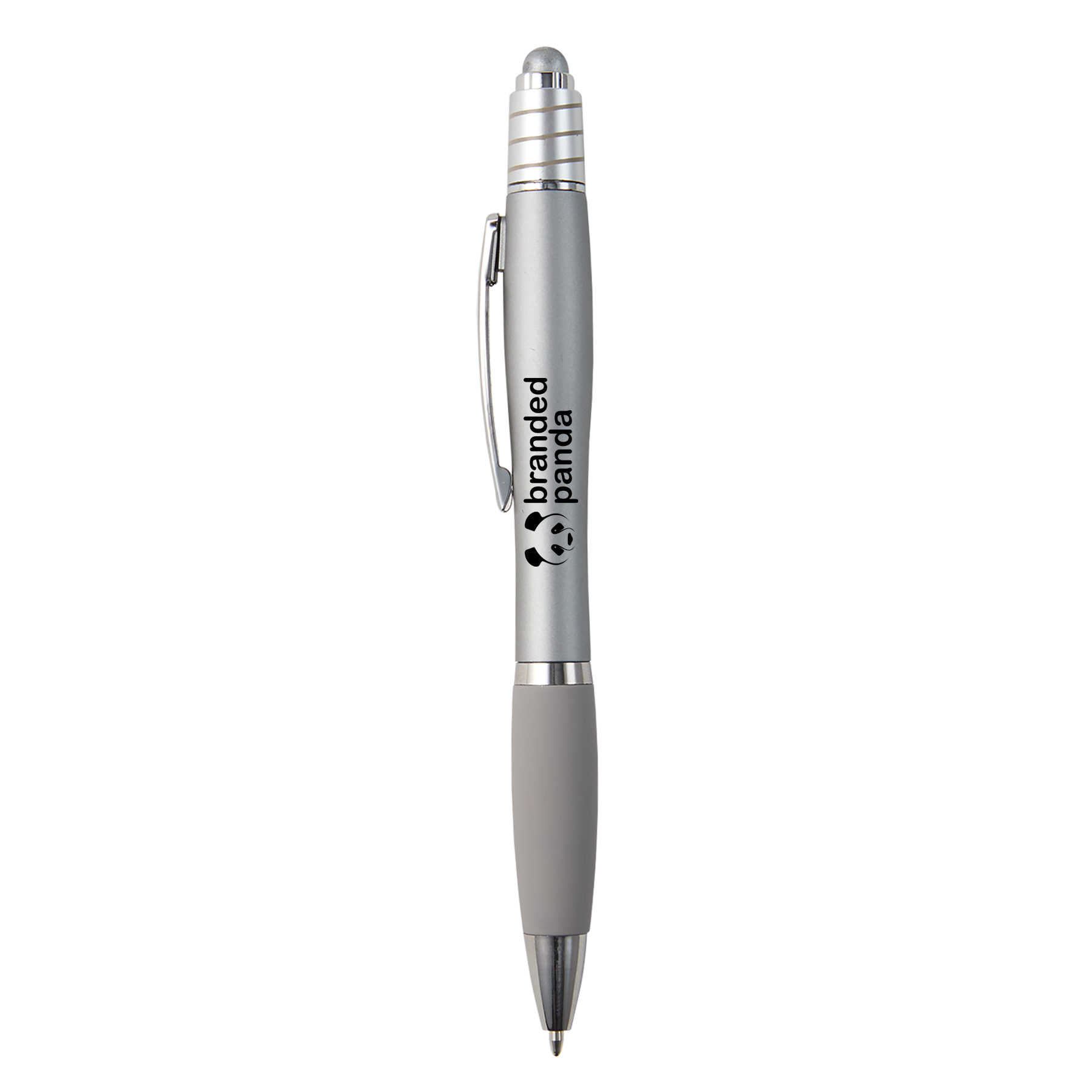 Classic curvy retractable ballpoint Stylus on top Silver spin top with colored line Relieve stress with the spin top Matte metallic colored barrel & grip with chrome ferrule, plunger, clip, & ring High-quality Glide-Write™ ink