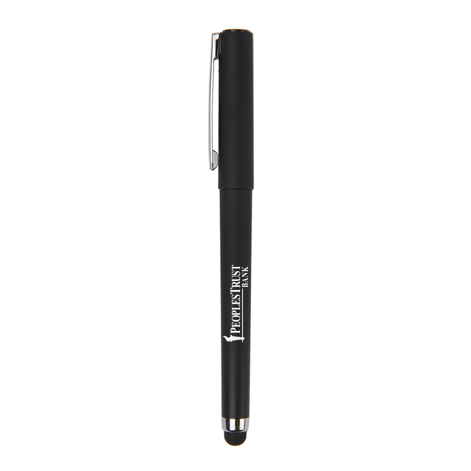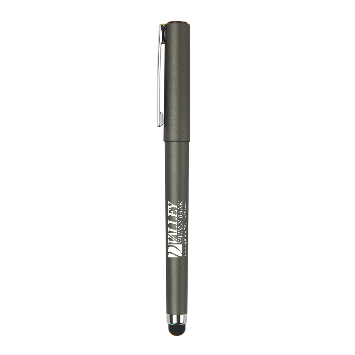 Two-piece gel pen - cap on barrel design Comforting soft touch feels great in the hand Metallic colored barrel with grey grip Chrome clip & accents Responsive capacitive soft silicone stylus on bottom Black medium point High-Quality Gel Ink