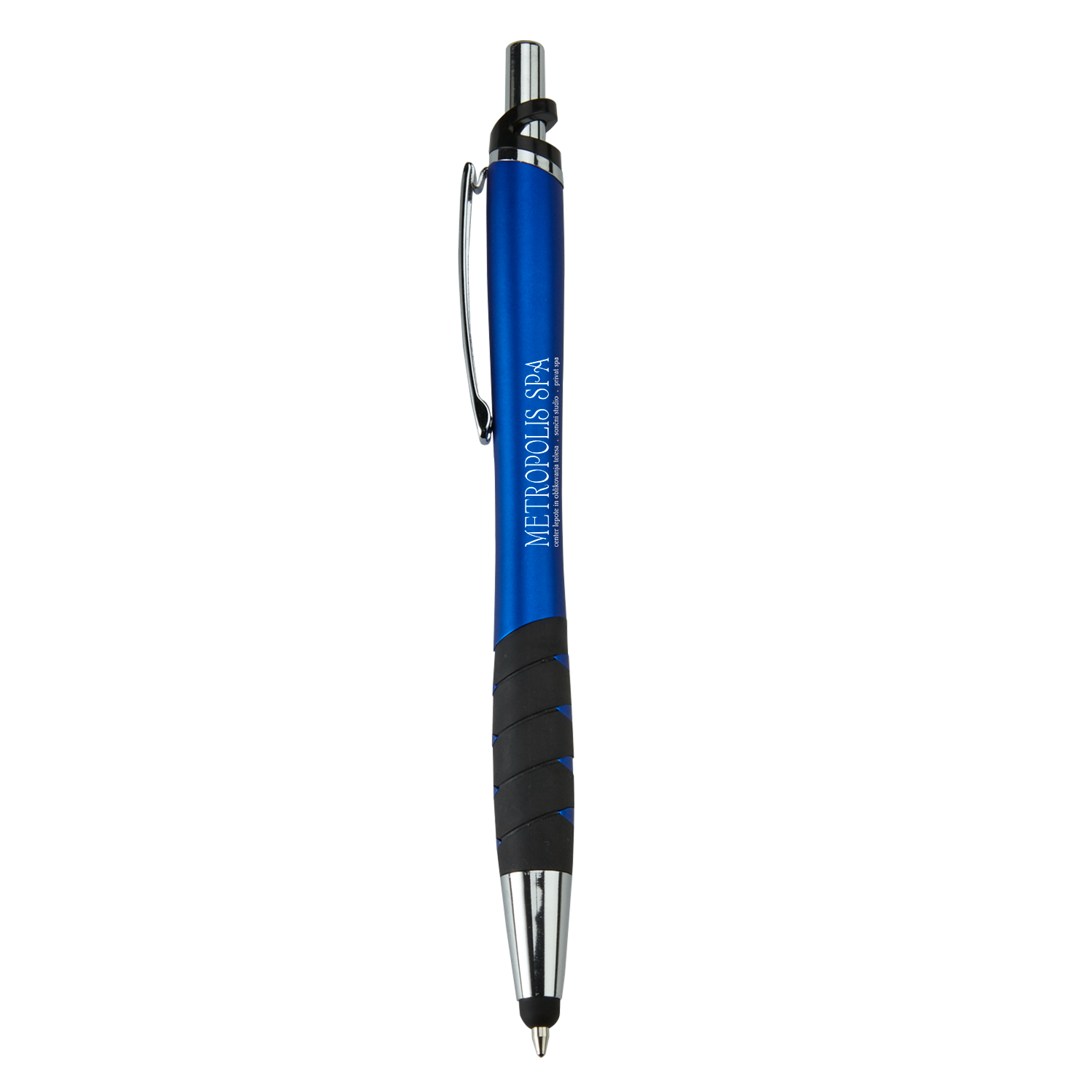 Modern retractable ballpoint pen Responsive capacitive stylus Metallic colored barrel with chrome ring, ferrule and plunger Sleek black rubberized grip with peek-through matching colored accents Refill extends through soft silicone stylus Black medium point High-quality Glide-Write™ ink
