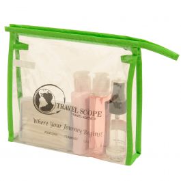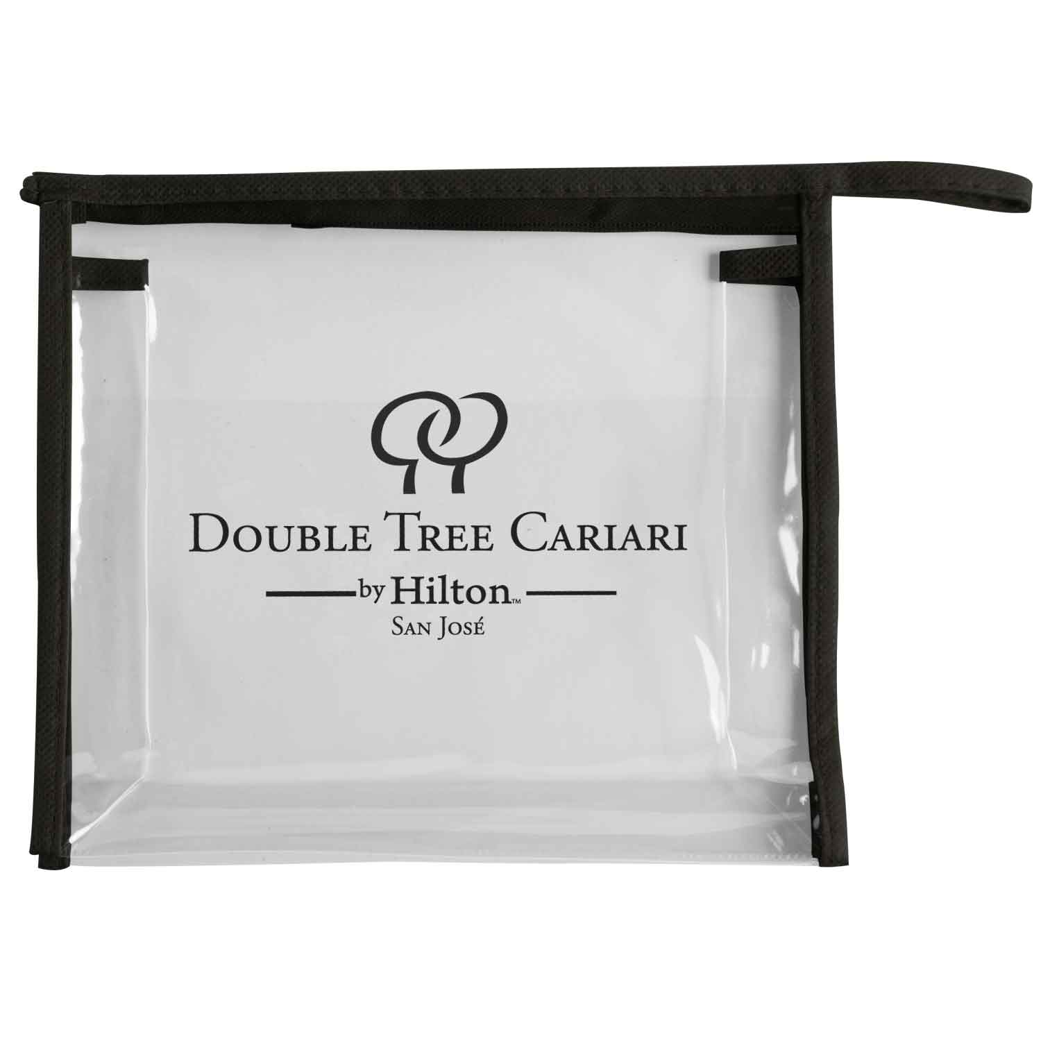 Constructed of clear PVC and non-woven colored accents Top zippered closure and pocket on front