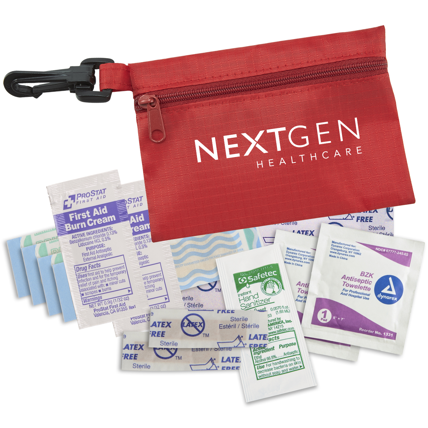 Includes 4 latex-free bandages, 2 snip bandages, 2 antiseptic towelettes, 2 first aid cream packets, a hand sanitizer packet and a 2" x 3" adhesive pad
